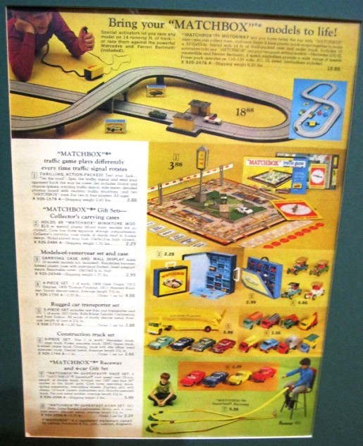 我曾随意翻看我在过去就火柴盒玩具做的一些记录,并惊奇地看到火柴盒在过去45年中所获得的成就。Leslie Smith和Jack Odell于1968年12月被英国女王授予“帝国荣誉军官奖章”,以表彰其在业界的成就。当时莱斯尼公司拥有约6000名员工,产品远销130个国家。截止当年6月底,有7家莱斯尼工厂计划投产。此外火柴盒为了刺激销售还开发出了多种模型系列,例如Matchbox Build-a-Road(chenly75: 用塑料片拼接出道路,给Regular Wheels系列的小车行驶的汽车城市,也是后来的MotorCity的最早期雏形), Matchbox Traffic game以及Matchbox Motorway No. 12(chenly75:一种靠压力线控的汽车轨道系列)。火柴盒还加入了一个新的服务区附件系列以及三个不同大小的便携式收纳盒。在英国的零售店和非自助式售货店内到处可见各种板卡展示架,这可能对火柴盒的收益毫无帮助,然而那不仅仅是玩具店才会分享到的火柴盒的成功。上周有位车迷告诉我,他是从一家电器展示商店Curry’s买到火柴盒模型的,在我的家乡,那只是一个调剂品商店,而且总是最早上架火柴盒新品的地方。在美国的零售店,尤其是药店能提供更多种类的宣传品。如果愿意,店主就能订购宣传单上的模型品种,并且以透明塑料盒包装。落地的展示架一次可展示240个模型。