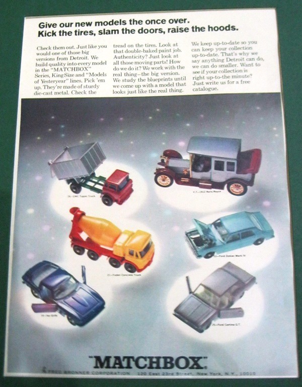 小比例的火柴盒售价在1968年仅2/2d (11便士)。(MCCH老鸟Administor:相当于59美分)口袋目录中预示着将会发行10件新品,而到年底前,会有另外的8件模型加入到火柴盒小比例队伍中,新品发行更是以每三周一个的的惊人速度进行着。1968年的发明被称为“Autosteer”。Dinky和Corgi都曾在其大比例模型中运用过这个功能,但却认为无法将驾驶机制移植到小比例系列中。没有其他小比例厂家能够像火柴盒那样开发出如此完美的迷你驾驶系统。这在1969年的首版口袋目录中有这么一则广告:“火柴盒的另一个第一,火柴盒是仅有的可驾驶的小比例模型。该独特的装置,由火柴盒设计团队开发,使得火柴盒在简单的压力作用下就能行驶到任何地方。请关注火柴盒近期即将发行的新品。”