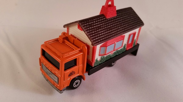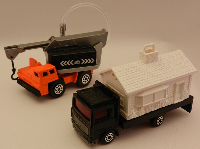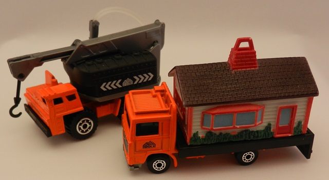 House Transporter 套装由一台改装过的MB315 Volvo Flatbed Truck搭载可变色房屋和一台改造吊车部分的MB314 Mobile Crane组成(chenly75:根据图片,原文中的MB314,应该是MB140,因为吊车手臂部分是140/49的部件,并没有加装侧面的推杆)。 当第一次见到这个套装的时候,我非常兴奋,以为火柴盒官方正打算以一些Lesney的经典产品为蓝本重新发行一些新产品。我觉得黑白反差很漂亮。当我见到最终样品上采用明亮的配色时,我有些失望。平板车上载有房屋的产品从未正式发行。而吊车在加装水罐以后吊臂仍然能工作。