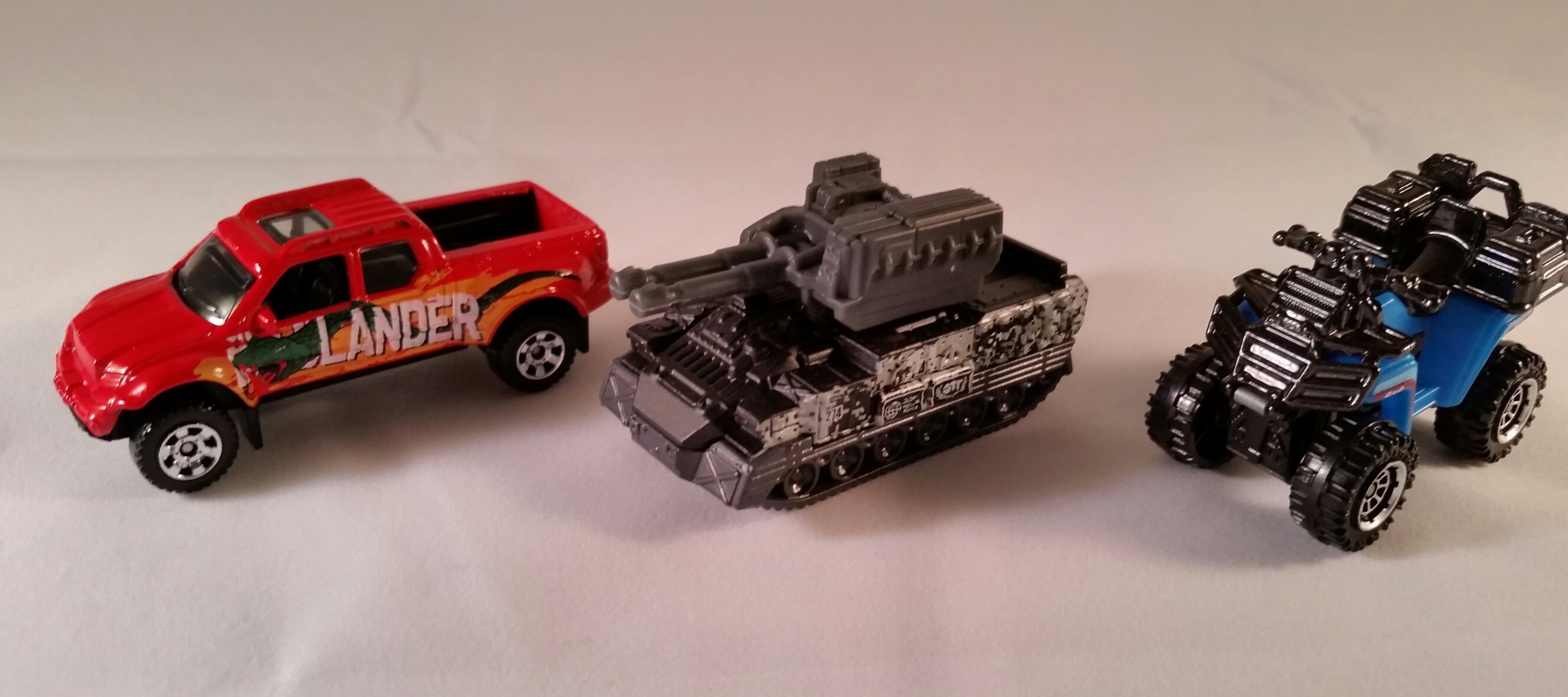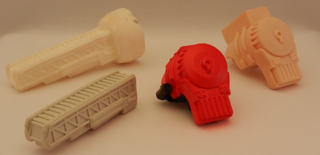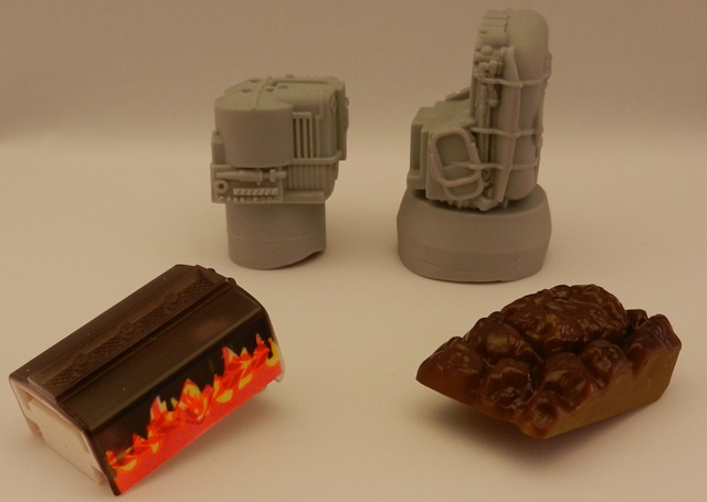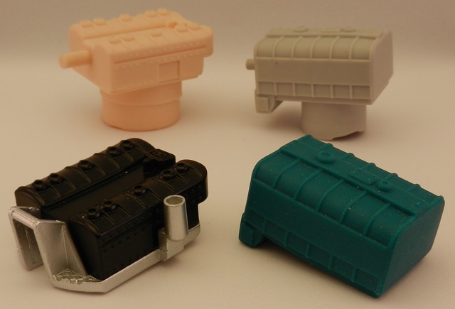 以下是原形样品部件 (顺时针方向从左到右分别是):彼德彪罐车的变色部件最终样品(Tanker Blaze套装)、为GMC Wrecker开发的整块灰色橡胶制成的水罐(Bear Attack套装)、为Isuzu Amigo开发的整块灰色橡胶制成的水罐(Shark Attack套装)以及为Faun翻斗车开发的可变色泥土最终样品(Mining套装)。