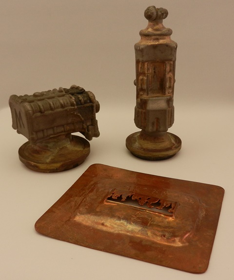 后排:为彼德彪罐车(Shark Transport套装)和Mission Chopper(Police Siege套装)开发的橡胶水罐模具。前排:用于移印彼德彪罐车(Tanker Blaze)侧面图案的红黄色可变色涂装的铜质印版。