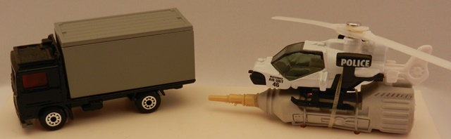 TB 006 Police Siege 套装开始变得有些暴力倾向。其中的MB148 Volvo Container Truck在车厢内的后部装配有塑料制成的枪手和钱袋金砖等整体造型。MB153 武装直升机则在底部加装水炮/导弹。最初的原形是黑色的Volvo卡车加灰色集装箱,印有Moving Co.的图案。当遇热水时,集装箱将呈现半透明状,里面的枪手和钱袋金砖等一目了然。还有就是,当喷上水以后,集装箱后半部箱体外侧开始显现“战损”状态,以便展示集装箱的内饰。武装直升机底部加装的巨型水罐代表了某种水炮或导弹。这个围攻场景的内饰有多种颜色,包括绿色、灰色和米色。直升机也有黑白色或蓝白色警察涂装。我认为后面那种才是即将发行的涂装。同样,这个套装也从未进入到开发阶段。
