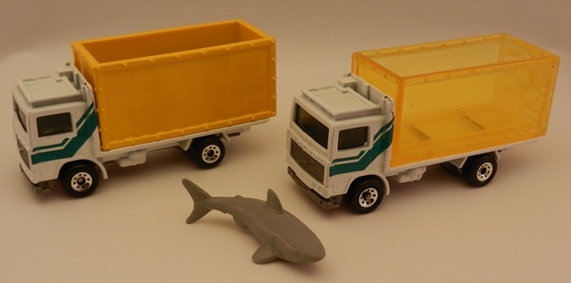 TB 004 Shark Transport 套装由改版的MB389 Volvo Tank Truck (敞顶) 和一件加装橡胶材质水罐的MB100 Peterbilt Tanker组成。该套装还配备一条鲨鱼。原计划发行的Volvo卡车采用湖绿色加白条纹的涂装,不过相反涂装的试制版也制作过。鱼缸边上醒目地标出了“Caution”(警告)以及鲨鱼的标志。据说鱼缸在常温下是不透明的黄色,而遇热水可以变成透明并能见到鱼缸内的鲨鱼。白色的彼德彪装上了同样湖绿色的水罐,上面标示白色的“H2O”图案,并配有水管。这里的透明塑料模型部分都没有涂上可变色的涂料。这个套装是否经过开发阶段也不得而知。