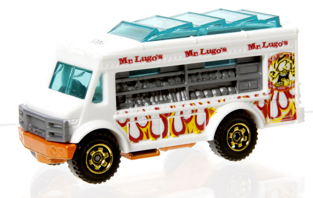 这台车是塑料车身,金属底盘,洛杉矶作为全球快餐业最发达的地区,很明显这台车带有浓重的加州风味。毫无疑问,火柴盒设计团队已尽力开发这款车型,而且我认为这款车将会出现许多涂装。以下省略当地特色快餐名称……