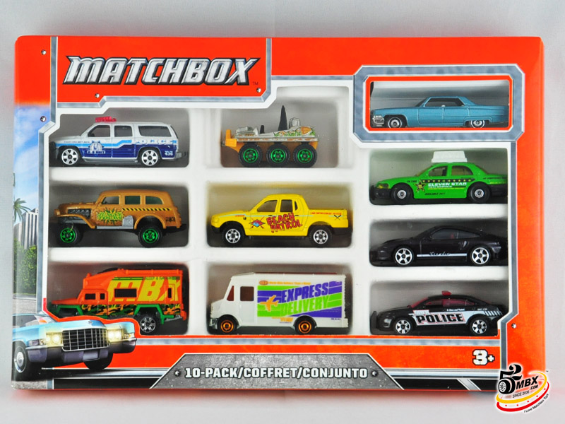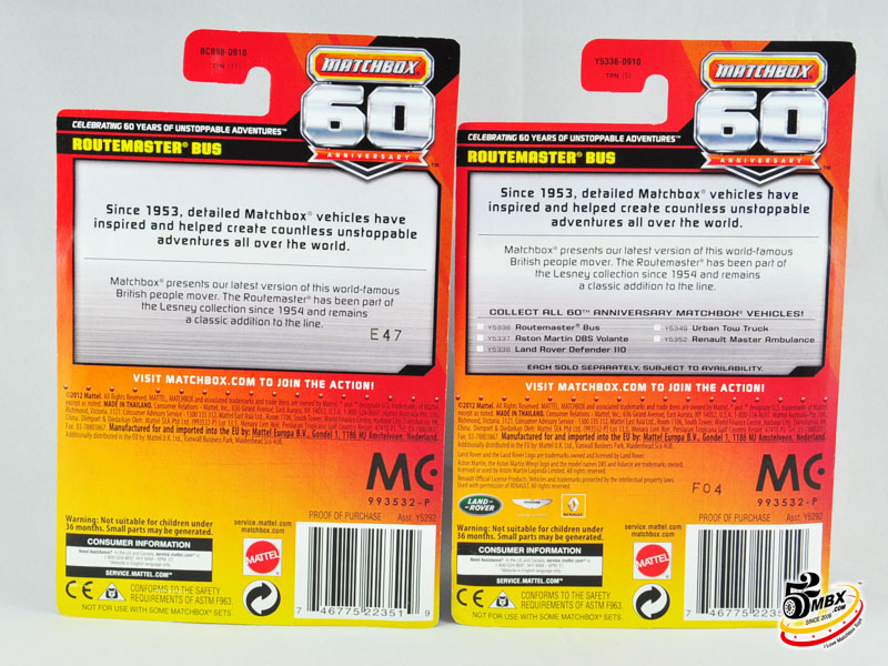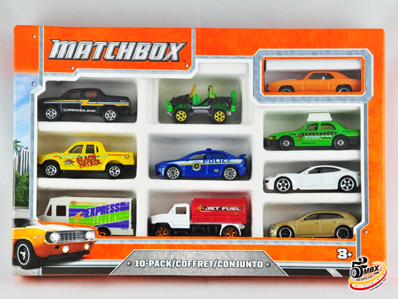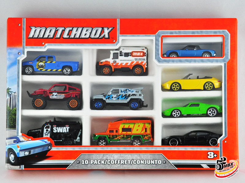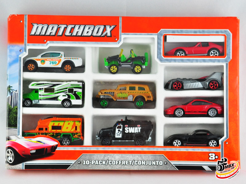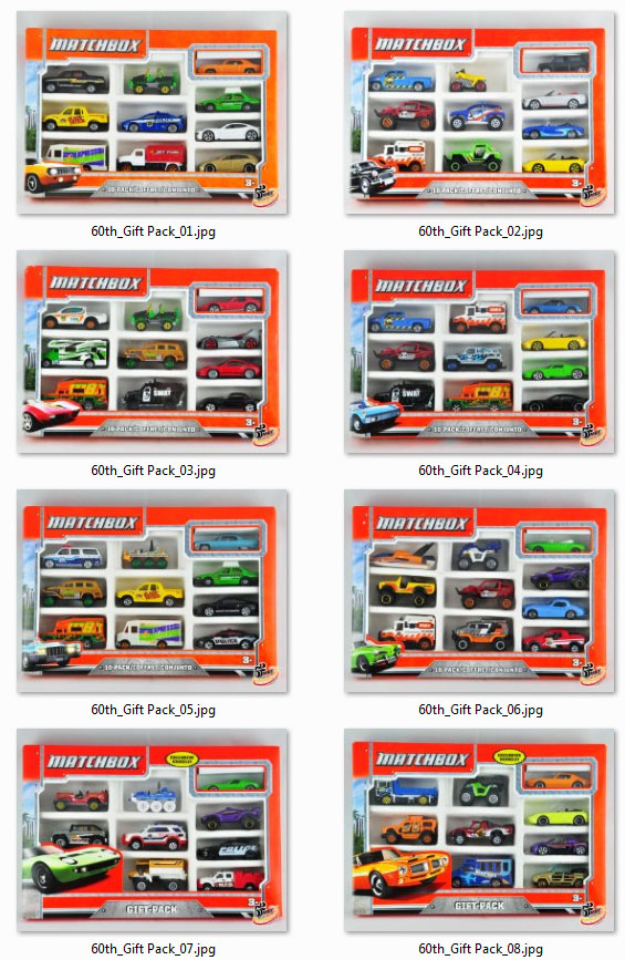 好了,单卡包装的纪念版就是这26款,但是更让人无法忍受的是,官方还发行了8款纪念版,并通过10件套里的唯一涂装(Exclusive涂装位于每个套装右上角)出售。好在其中有6款套装曾经在2013年底前的国内市场Matchbox最后清货期间在家乐福等超市卖场贱卖(当时差不多90元一套,几乎10元一辆的白菜价)。不过最后两套(火鸟和兰博),因为包装针对北美的9件套而最终没有进入中国市场。