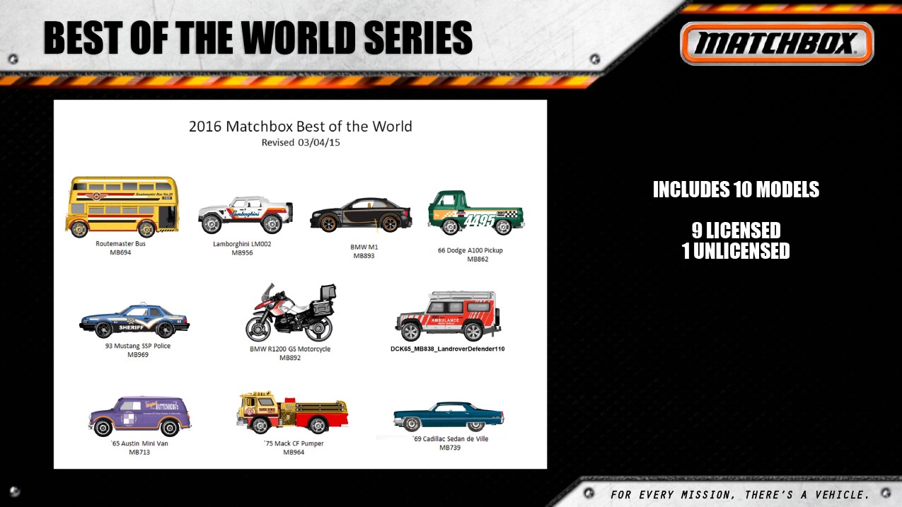 2016年火柴盒将推出一个新的世界精品系列——Matchbox Best of the World Premium Series(BOW) 。目前暂定为10件模型,其中9件是授权车型,1件是原创车型。下面是计划中的产品(已经是10件产品了,而且都是授权车,显然不会是最终的结果。)所有模型采用与Supreme Heroes(SH)精品系列相同的车轮,并且保证四面都有涂装。