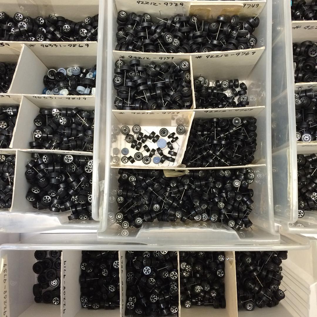 3)下面是各种火柴盒车轮轮对,据说从环球开始,这些都是马来西亚生产的。每个小隔间上面标了产品的零件号,但是如此密集的零件盒,如果工人装配时抓错了,就成为了错版,你还会觉得自己很幸运仅仅因为买到了错版?