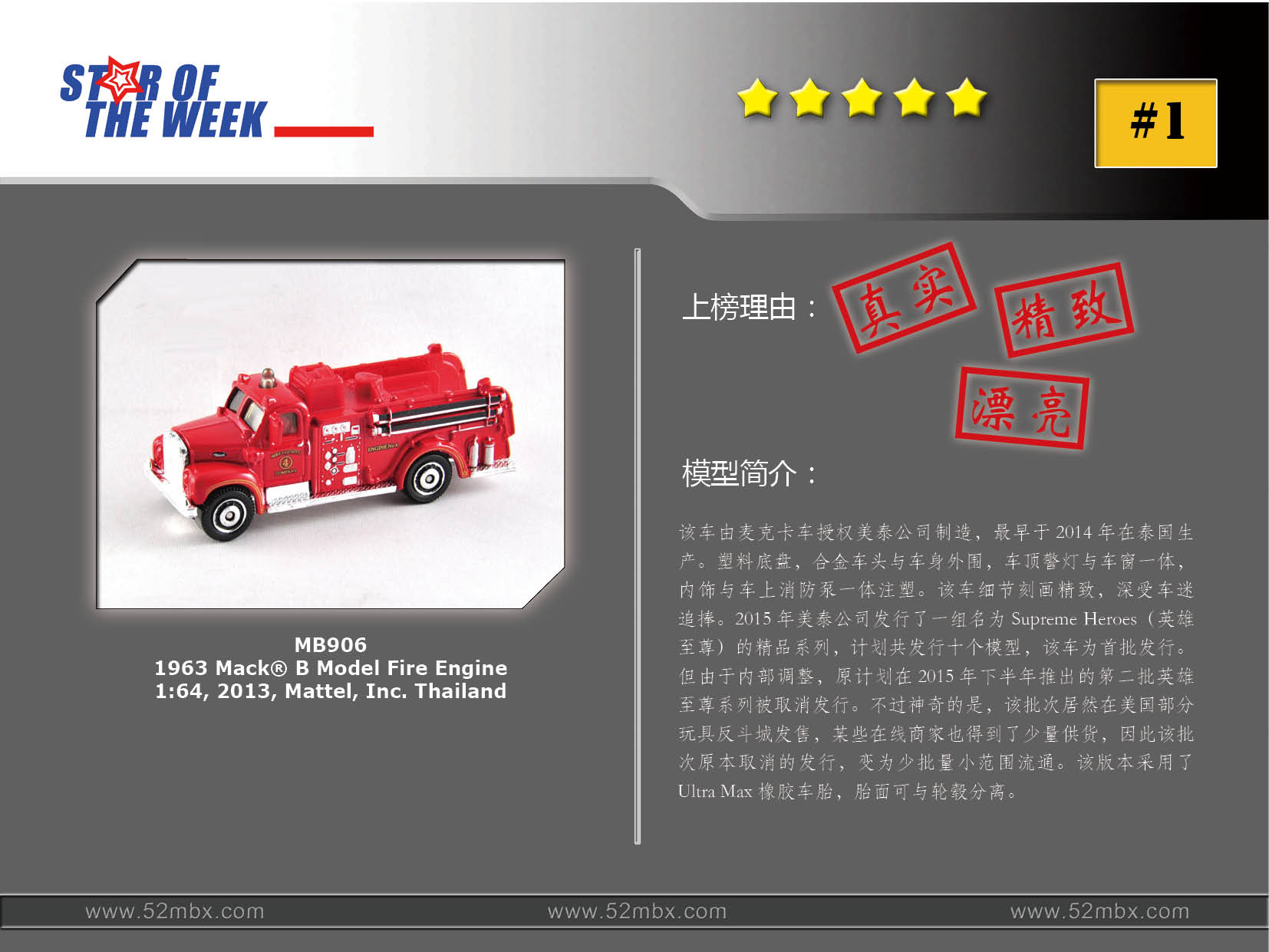 #1 – 1963 Mack B Model消防车是近年来美泰火柴盒少有的力作,之前最后的一个相似版本是一台DYM系列的半挂拖车。从小比例车身设计来看,这台MB906显然要比16年前的DYM更精细。尽管底盘没有镂空的悬挂,但是由于没有拖挂部分的束缚,自然更适合3英寸小比例的尺寸。