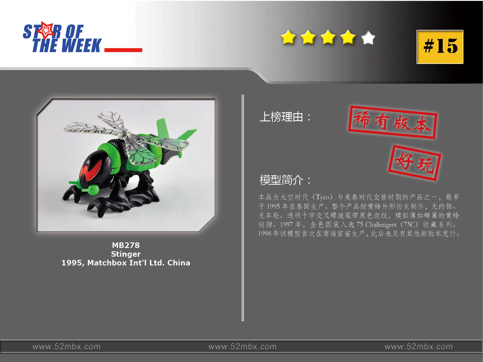 #15 – Stinger,Tyco和美泰交替时期的产品,造型前卫,功能强大。最喜欢的是螺旋桨叶,既能旋转,又模仿了昆虫翅膀的质地,确实值得拥有。