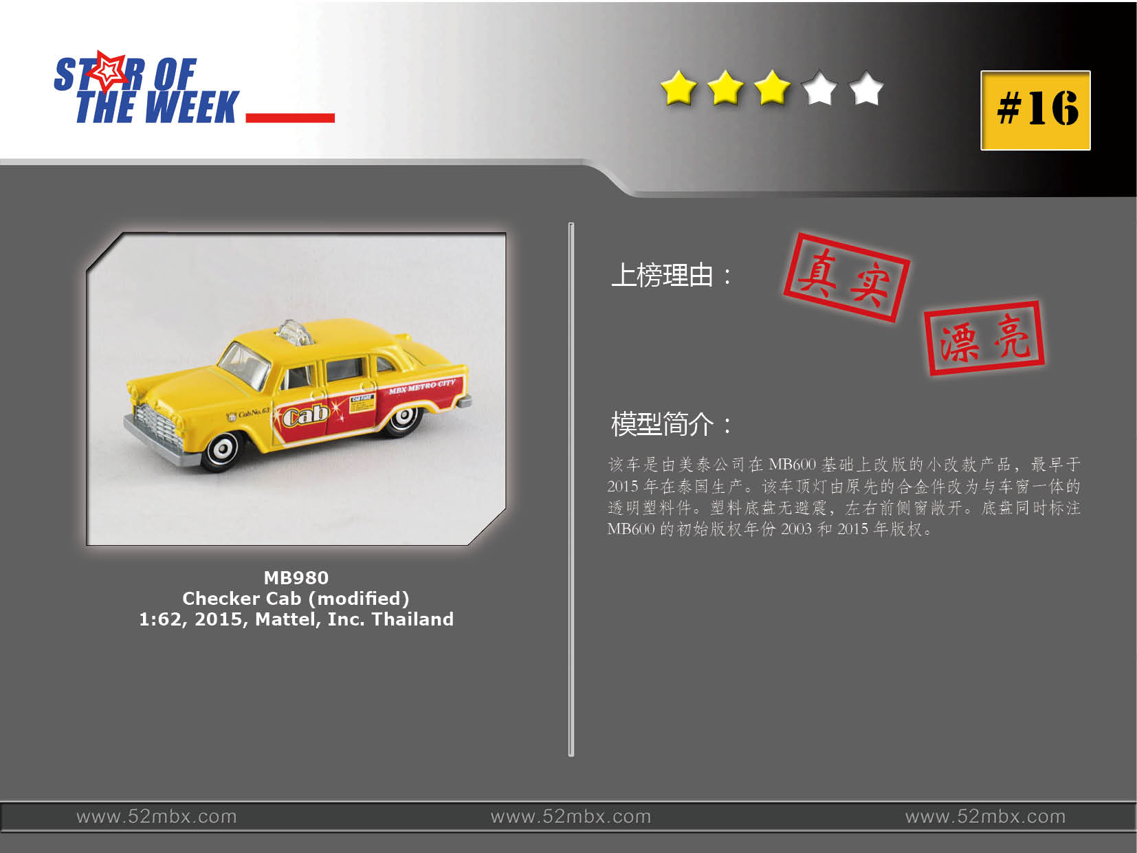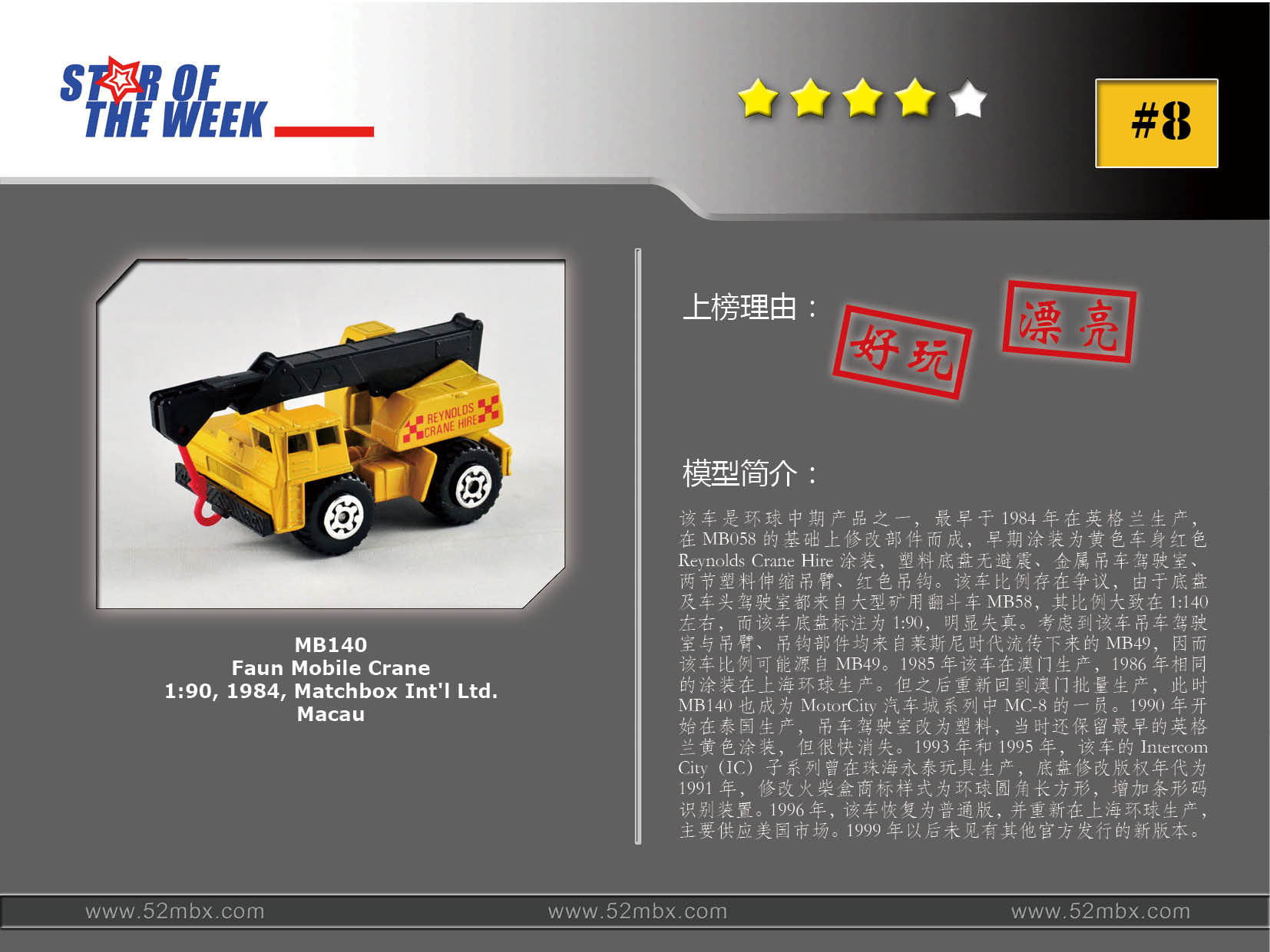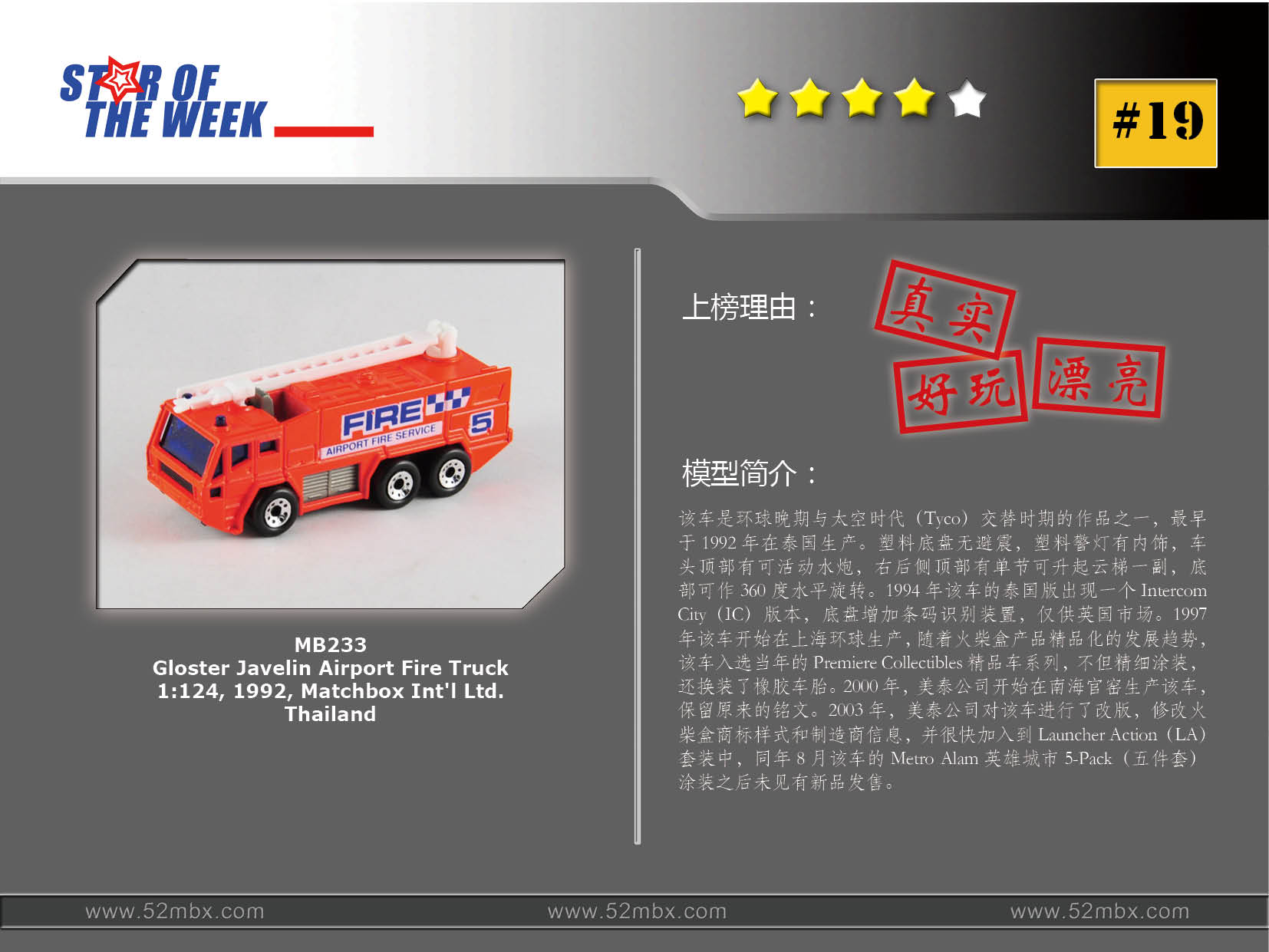 本站改为博客之后,随即开设了一个旨在介绍火柴盒玩具小知识的栏目——“每周之星”(Star of the Week),目前已有32辆火柴盒小车上榜,且仍在每周更新。在这些小车背后,或多或少都有一些耐人寻味的故事和稀奇古怪的上榜理由。本文仅以本人的理解,对这些小车作一个简单回顾,并非选购指引,也没有价格导向作用,所以各位看看就好。![]()
