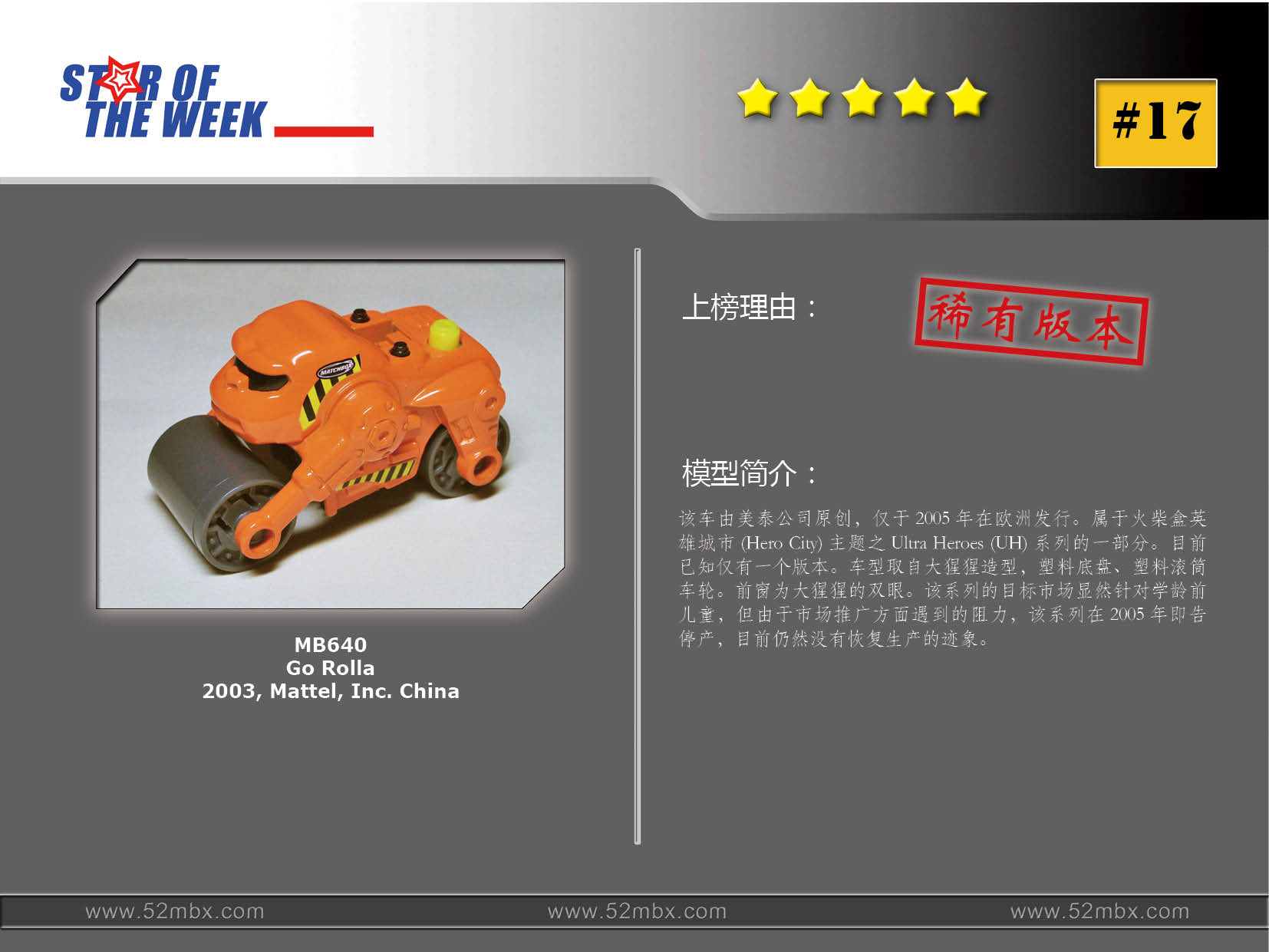 #17 – Go Rolla,名字很讨巧,因为造型就是大猩猩,英文不就是Gorilla么,另外车型是台压路机,英文正好是Road Roller,于是就有了这个杜撰得非常有趣的名字。这台车2004年暑期曾经在上海的淮海路百盛以及浦东第一八佰伴销售过,可是当年正值美泰火柴盒首次回归中国市场,上市的大多是2003年的Ultra Hero系列——被大家戏称为“妖怪系列”,因此这台车并不受人待见。我当年虽然没有如此憎恶这个系列,但也没有喜欢到要立刻拥有的地步。直到2007年,我的认识才有所改变,但此时要寻找这台车已经比较困难了,因此直到2010年,我才最终从eBay得到。拿在手里死沉死沉的,要知道这车壳整个都是合金的,看着就为前后那俩轱辘担心了。