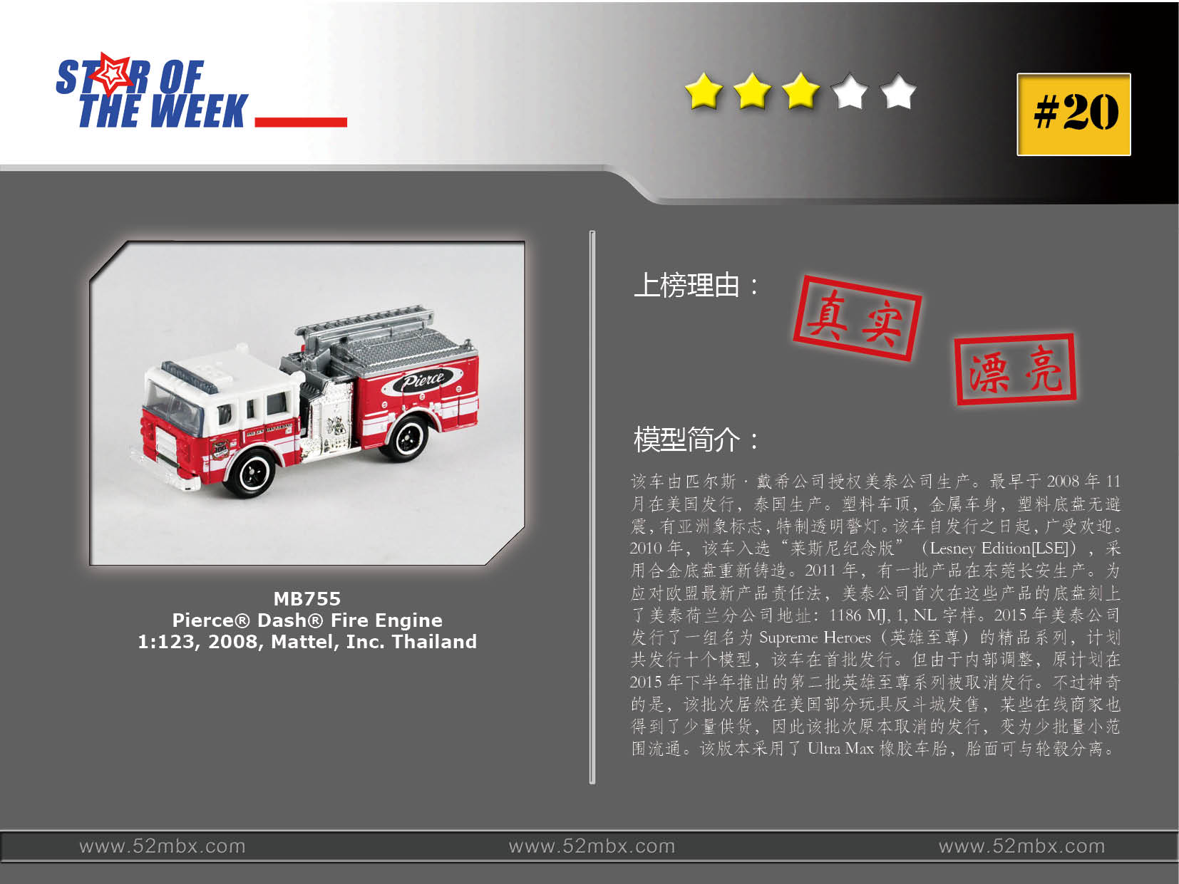 #20 – Pierce Dash Fire Engine – Pierce 100th Anniversary匹尔斯百年版本。虽然是个常规版本,但是涂装非常好,而且配合板卡彩绘,还挺有纪念意义的。另外,由于车身零件数量的原因,2016年,这台车将退出常规系列,真是且行且珍惜啊。![]()