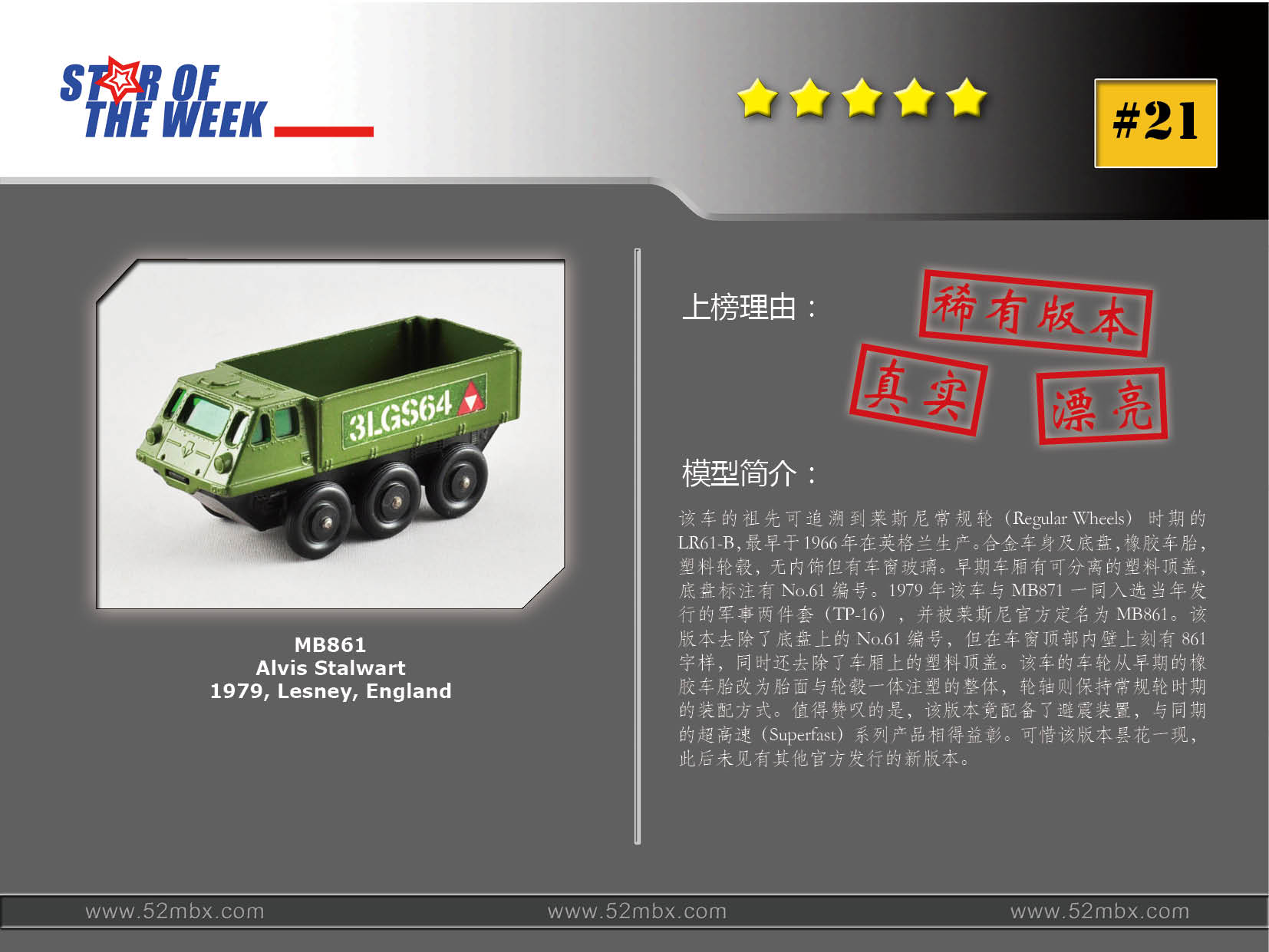 #21 – Alvis Stalwart军事复刻版,这个是Lesney晚期的复刻版本,原版的历史可以追溯到1960年代。不过别小看这个复刻版,至今能大量获得的可能性几乎不存在,我这也是海淘血拼了很久才得到的散包,因为品相还不错,于是心里就踏实多了。