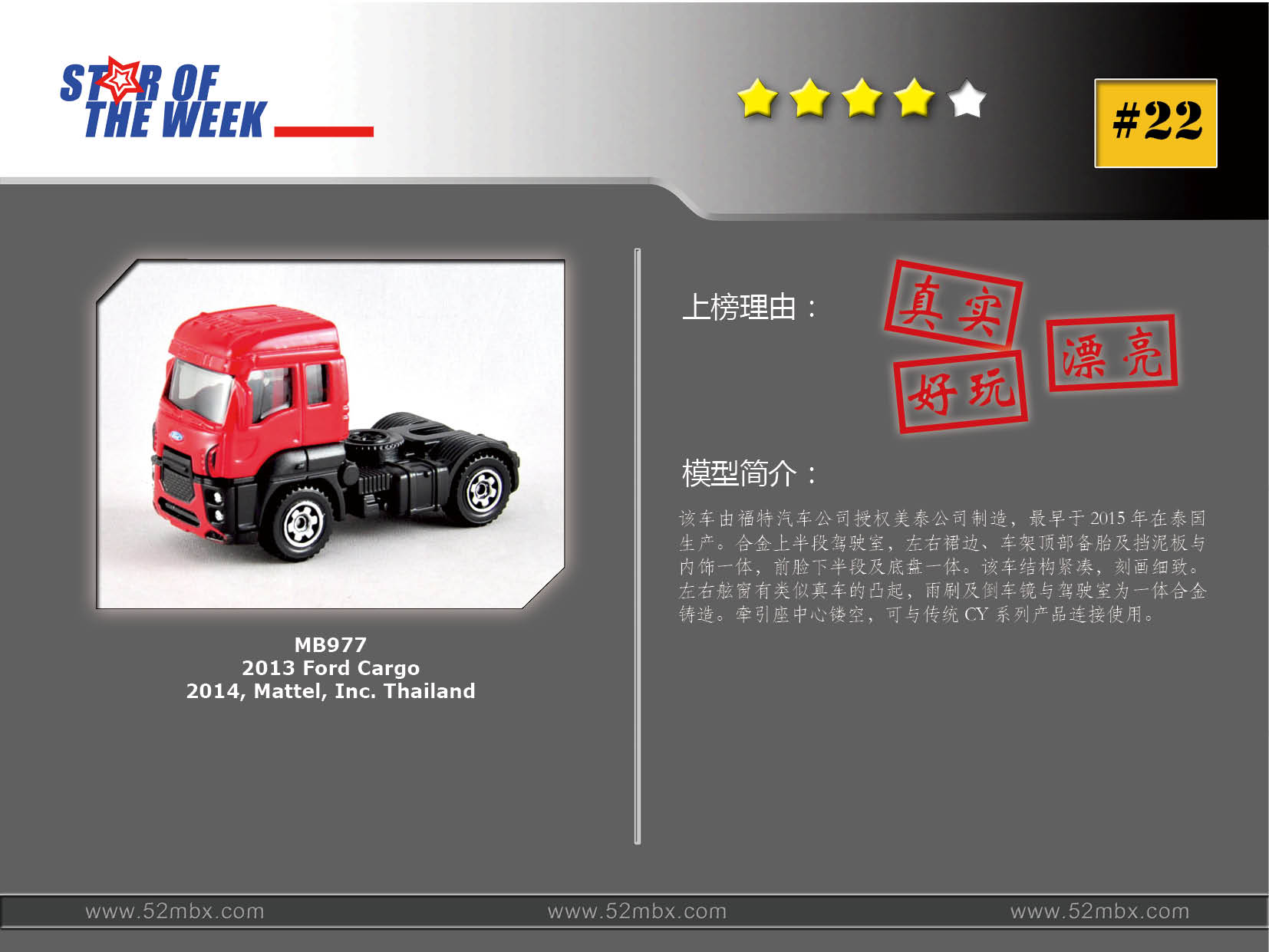 #22 – 2013 Ford Cargo,就在美泰火柴盒团队刚刚宣布即将发行这台车的时候,许多网友都错以为火柴盒会再次发行Convoy拖车系列。不过很快大使就辟谣称官方并没有复兴Convoy系列的计划。但凭良心讲,这拖头却作得非常精致,甚至比以往任何一款Convoy拖头都要用心。