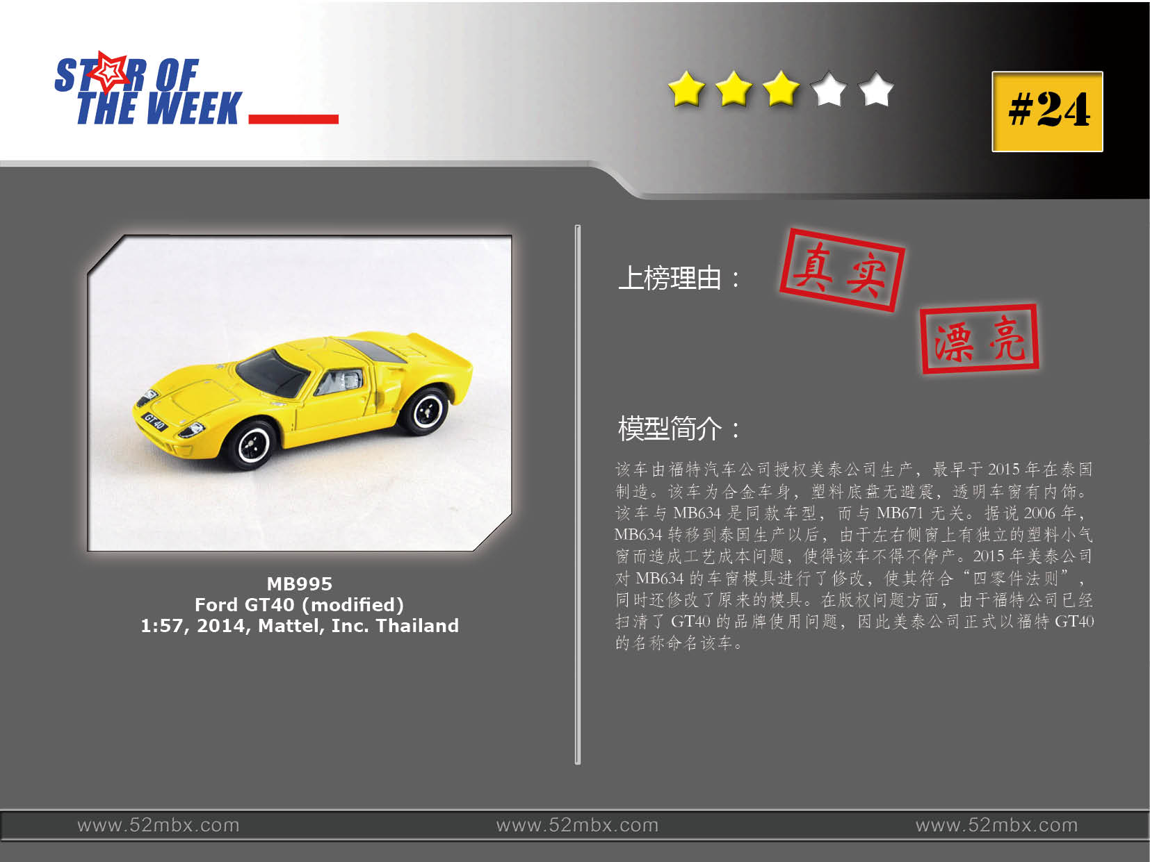 #24 – Ford GT40(改版),再次重申改版并非个个偷工减料,这台车就是很好的例子。之前的原版车是MB634,但由于当时福特公司正就GT40的名称归属问题与第三方打官司,因而所有的MB634都没有写GT40,如今法律问题已经解决,改铭文就显得顺理成章了。另外在制造工艺上,这里的MB995在车窗的处理方面也比MB634更好,使大量生产成为了可能。