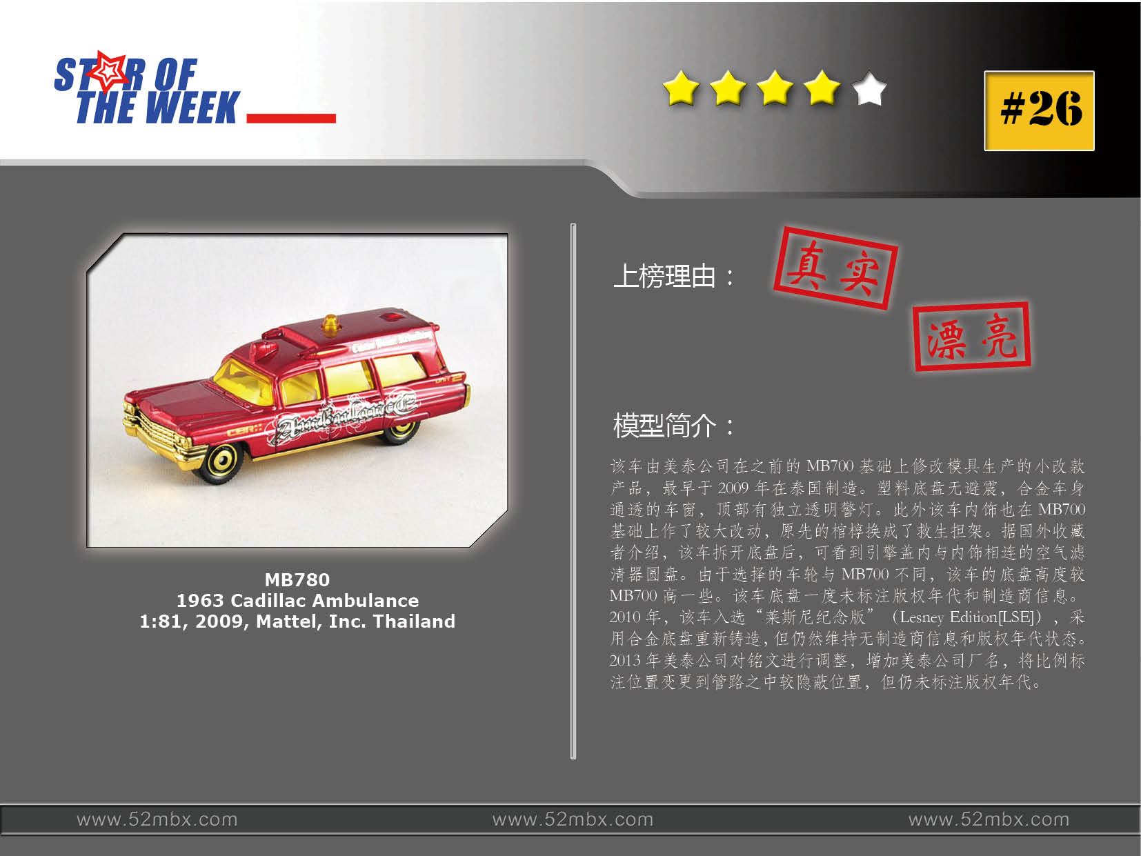 #26 – 1963凯迪拉克救护车,看着如今改版后的MB994——那令人无奈的桑拿天窗,你是否会怀念这台保留完整合金车顶的MB780呢?这是2011年的常规版本,但是这个版本当年也没有多少在国内流通过,相反2012年的末世纪奶白色涂装倒是泛滥过一阵子。
