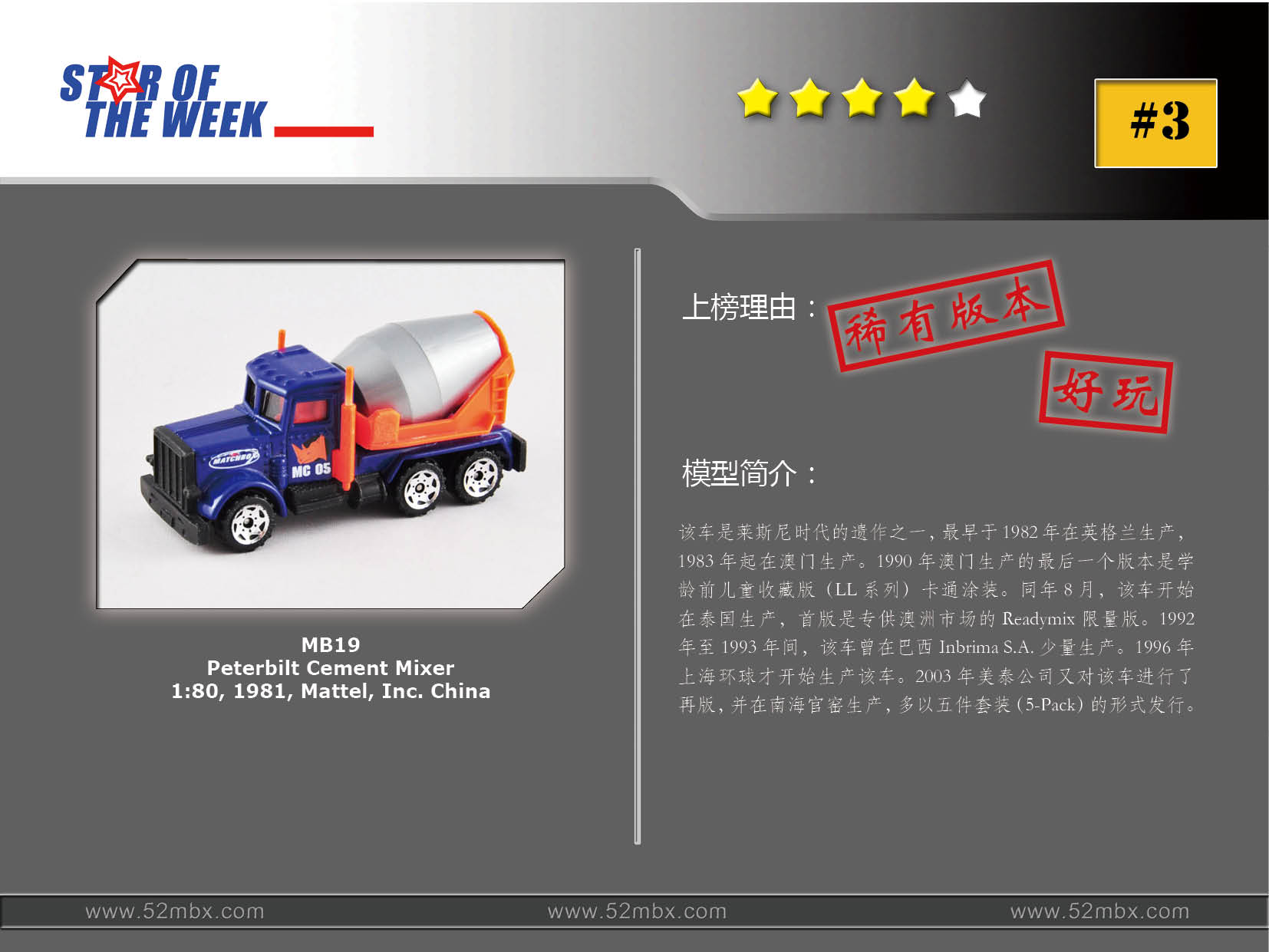 #3 – Peterbilt Cement Mixer(美泰复刻版),尽管没有镀铬的中网、排气管、滚筒托架和底盘,这台车却是非常稀有的版本。底盘上的椭圆标志,也仅出现在这个版本上,此后该车就彻底停产了。