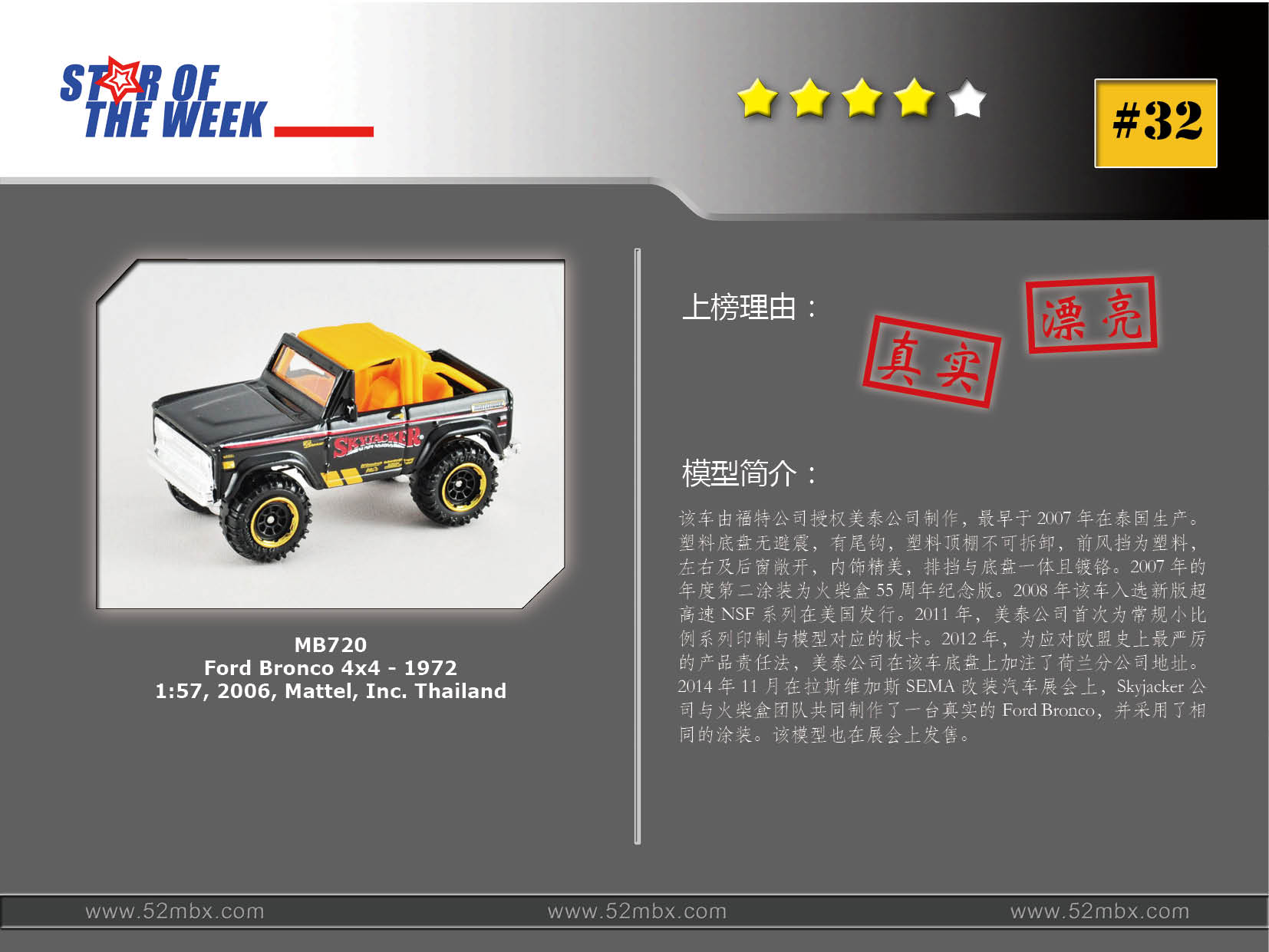#32 – Ford Bronco 4×4 – 1972这个SkyJacker版本还有真车参展,值得搞一个原包的来保存。