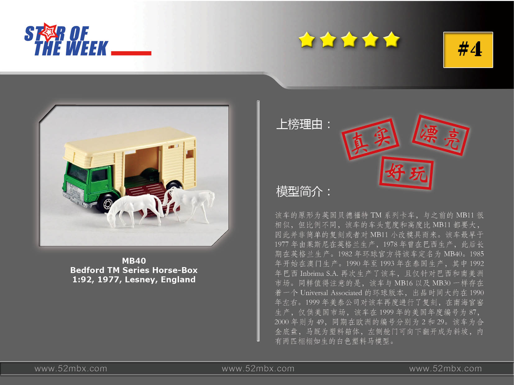 #4 Bedford TM系列马厩车是Lesney在英格兰的作品,这个涂装和配套的白马刻画非常细致,用“真实”、“漂亮”和“好玩”来形容一点也不为过。如今想要得到一台兼具真实性和趣味性的火柴盒可真不容易!