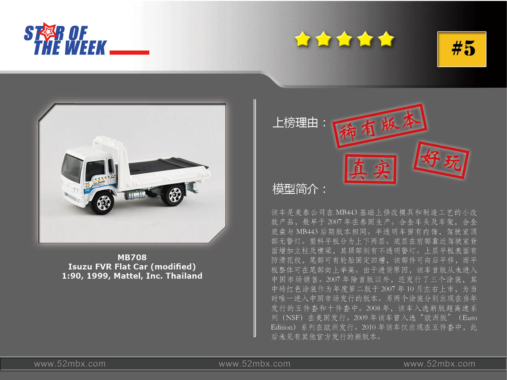 #5 – Isuzu FVR Flat Car(改版)这是2007年的首版,不过当年由于国内“跳货”,这个版本没有进入中国市场,而是年度第二涂装的砖红色版本短时间流行了一阵子,这台车也是我从eBay上淘来的,今年才加入到自己的收藏序列中。