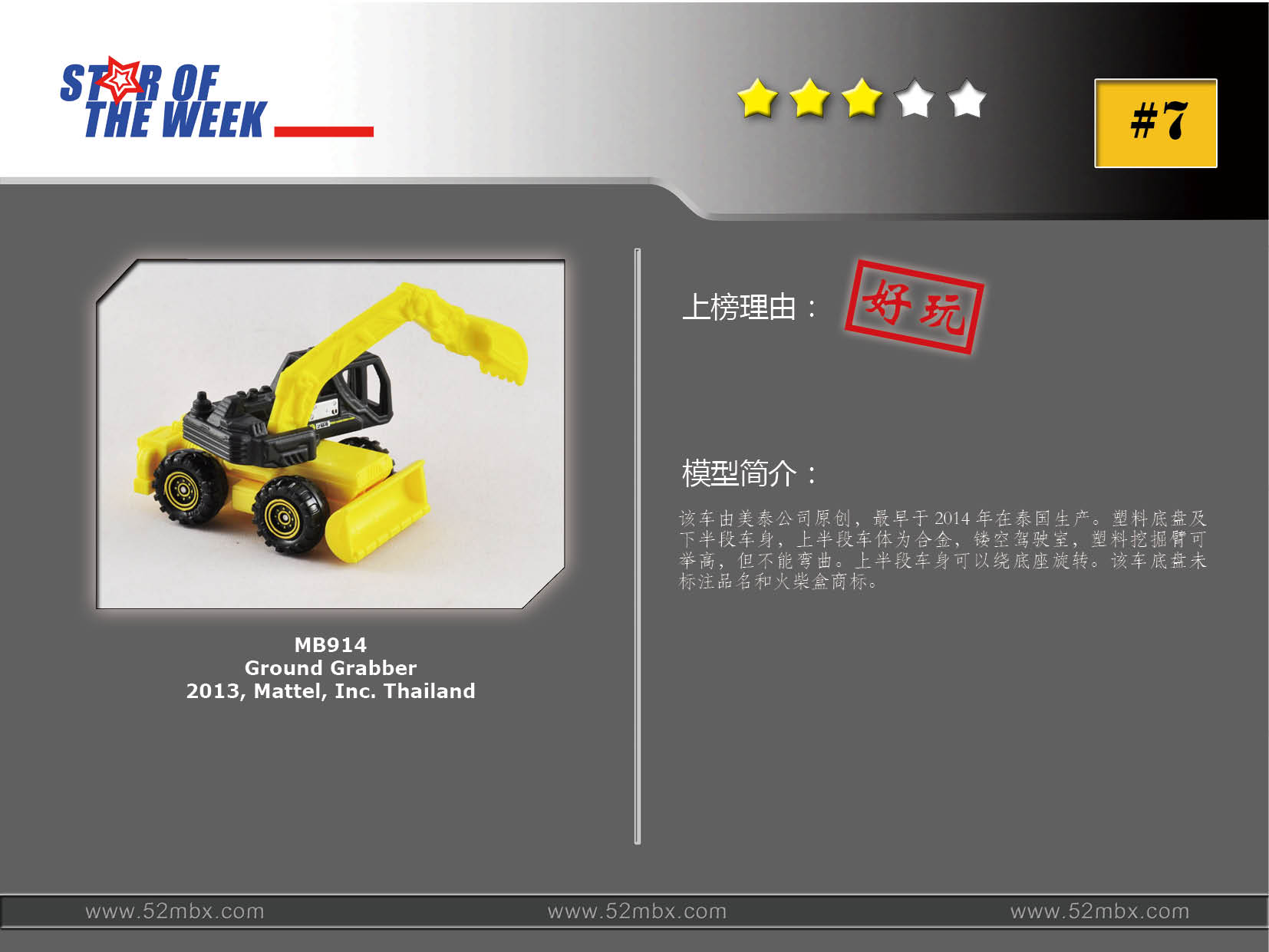 #7 – Ground Grabber,这名字真不咋地,但是模型设计得还比较好玩,虽然只有驾驶室这一点点合金成分,却也原创得比较真实,属于2013年以来少数成人也觉得有趣的原创车。