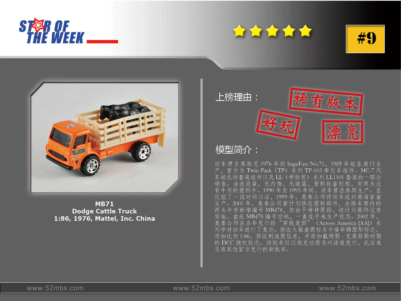 #9 – Dodge Cattle Truck,这台牛车来自火柴盒50周年穿越美国系列,没有什么特别,但同#3类似,在那个特殊时期,火柴盒底盘上的椭圆型商标也就在这个版本上出现过,之后也没有继续生产。