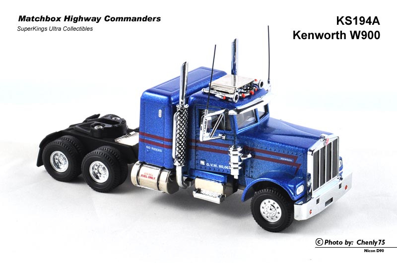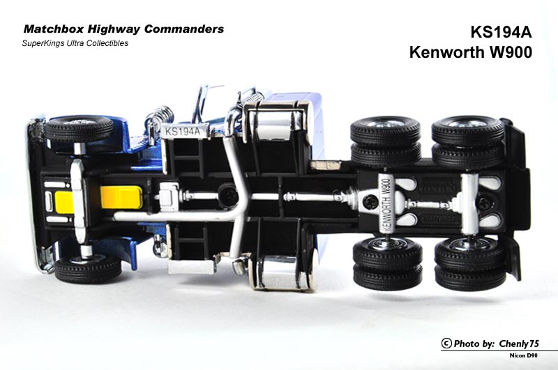 先来讲讲K193 Peterbilt 359。这台车其实是以Lesney时代的K31模具为原形改造而来。车身上半部除了导流罩、烟囱、遮阳板、倒车镜和空滤以外,几乎与K31如出一辙,因而尽管采用10×8的轮式,拖车底座部分仍然保持了K31的样子,甚至仍然保留了K16to19的老编号。
