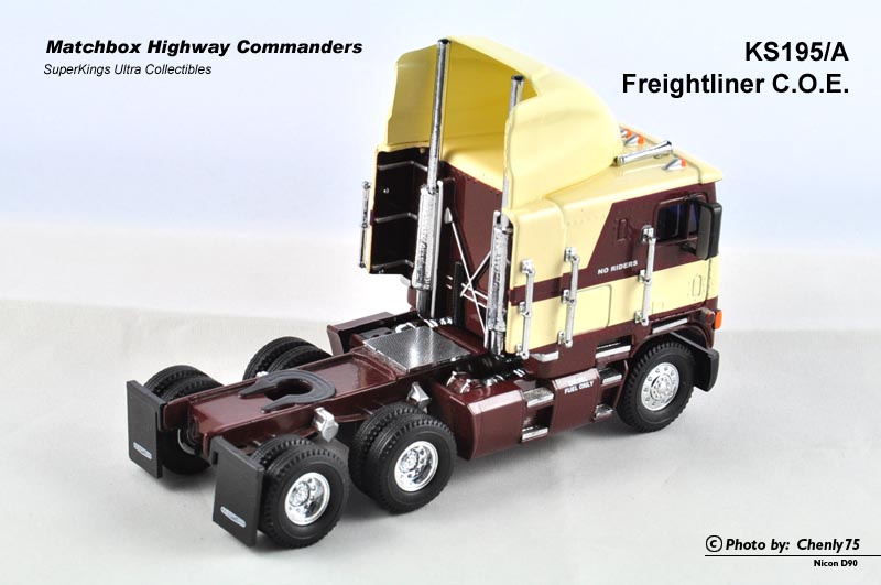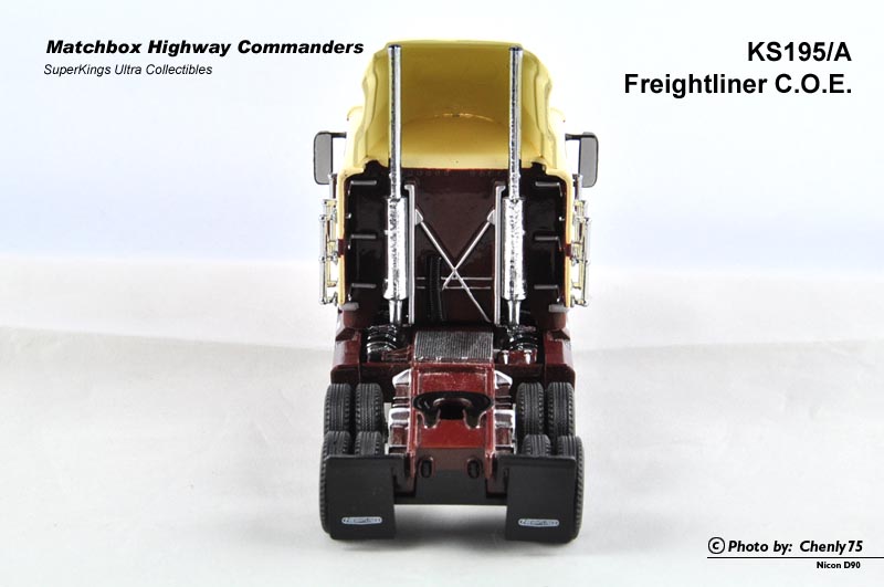 这个系列中另一台美式精品也是我非常喜欢的平头司机室版本的Freightliner COE。看过动画版G1《变形金刚》的一定认识这台车,没错就是第一代擎天柱的原形。不过现实生活中,这种平头的拖车头并不受美国司机待见,因为车头没有长鼻子,往往被认为缺乏安全感。在我看来,模型倒是很好地弥补了车型上的短板,至少把美国市面上的知名拖头都囊括其中,这也算是一种完美了。