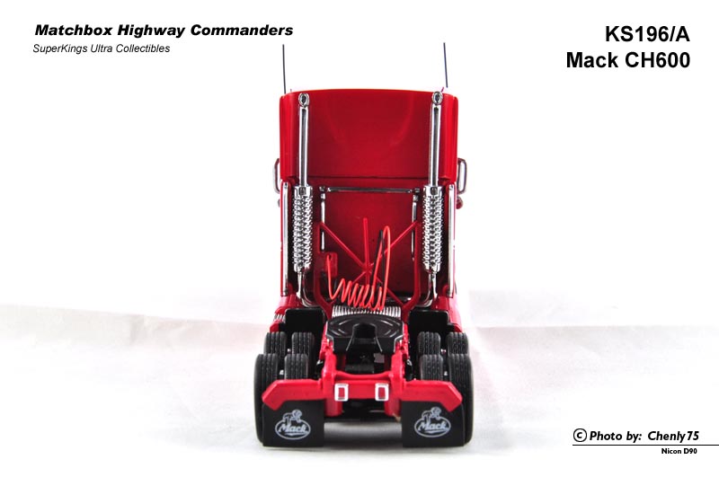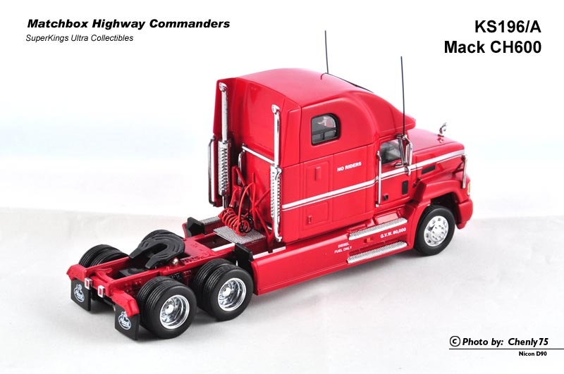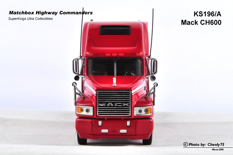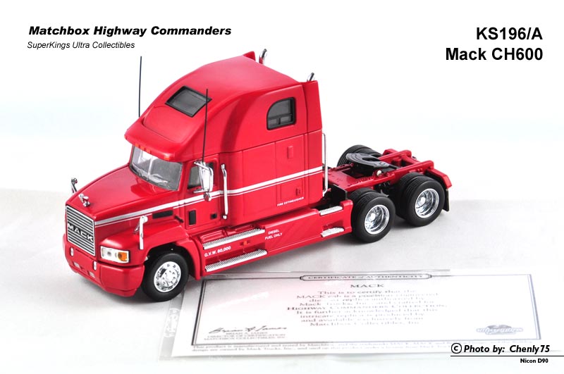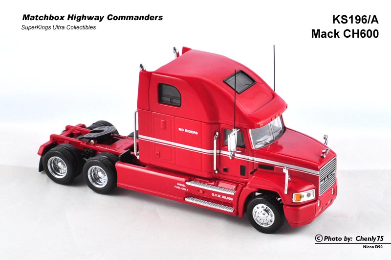 这个所谓的“公路指挥官”系列实际是从之前的K系列精品中筛选出颇具代表性的美国车型继续增加细节的产品,每一台车都不配套挂车部分,尽可能地把拖车头部分做好。其中尤以编号最靠后的K196 Mack CH600最为精细。我曾一度认为这台车的模具来自Franklin Mint,但这仅仅是一种猜测。