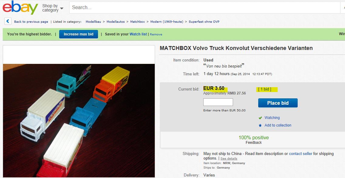 收车靠缘分,这话一点不假。389是我一直以来的怨念,四年前就开始在某贝上拼杀,但从未成功。而每次out bid后的价格却也水涨船高。直到今年夏天,我曾一次标到260刀,当然还是没中,连卖家发出的Second Chance也没有看到就过期了。时隔一个月,同一个卖家再次拍卖,那一次,我确信志在必得,抛出300刀,结果最后5秒被超出,此后一直没有机会了。我于是想,自己的389收藏也许真的要靠一台山寨的车来充数了。前不久,很偶然地在某贝德国网站上闲逛,搜索了一个从来与389套装名称毫无关联的关键字,居然从一堆车中发现了下面这个,毫不犹豫下注,那个起拍价实在可以忽略不计……