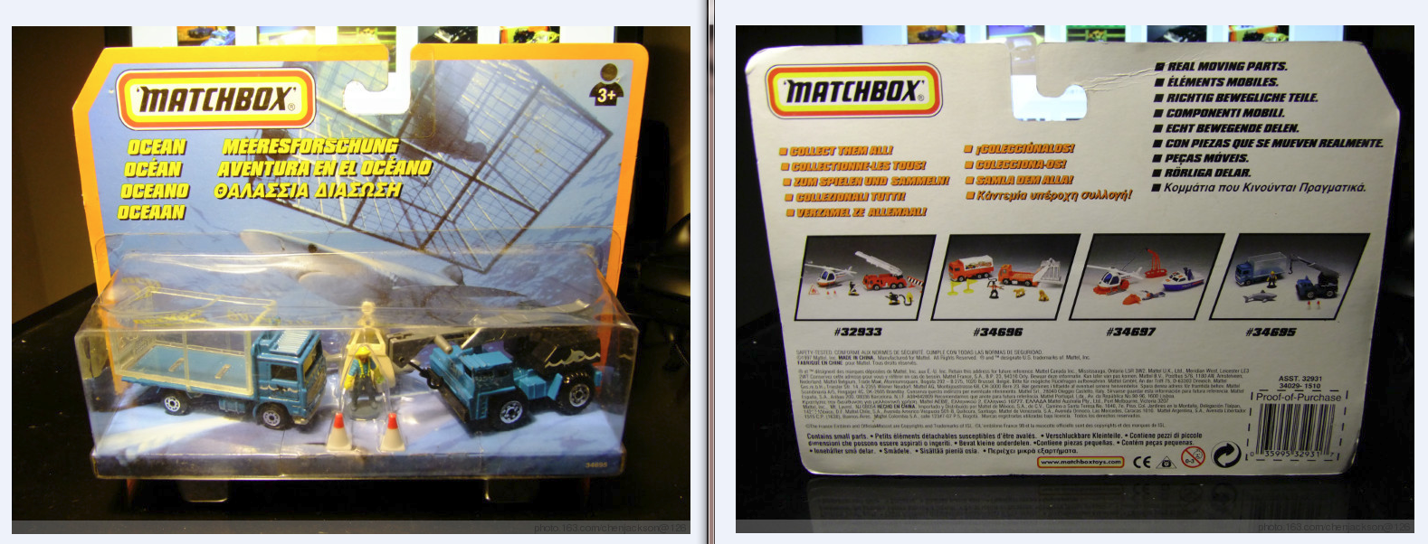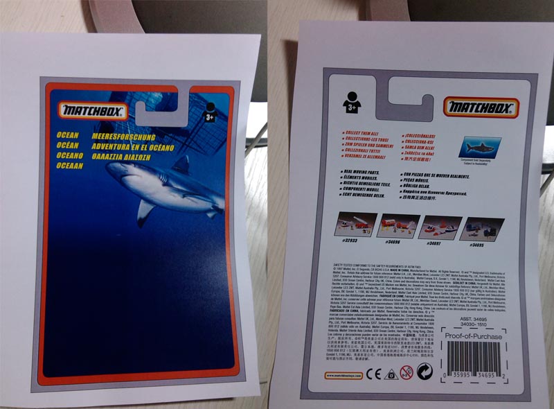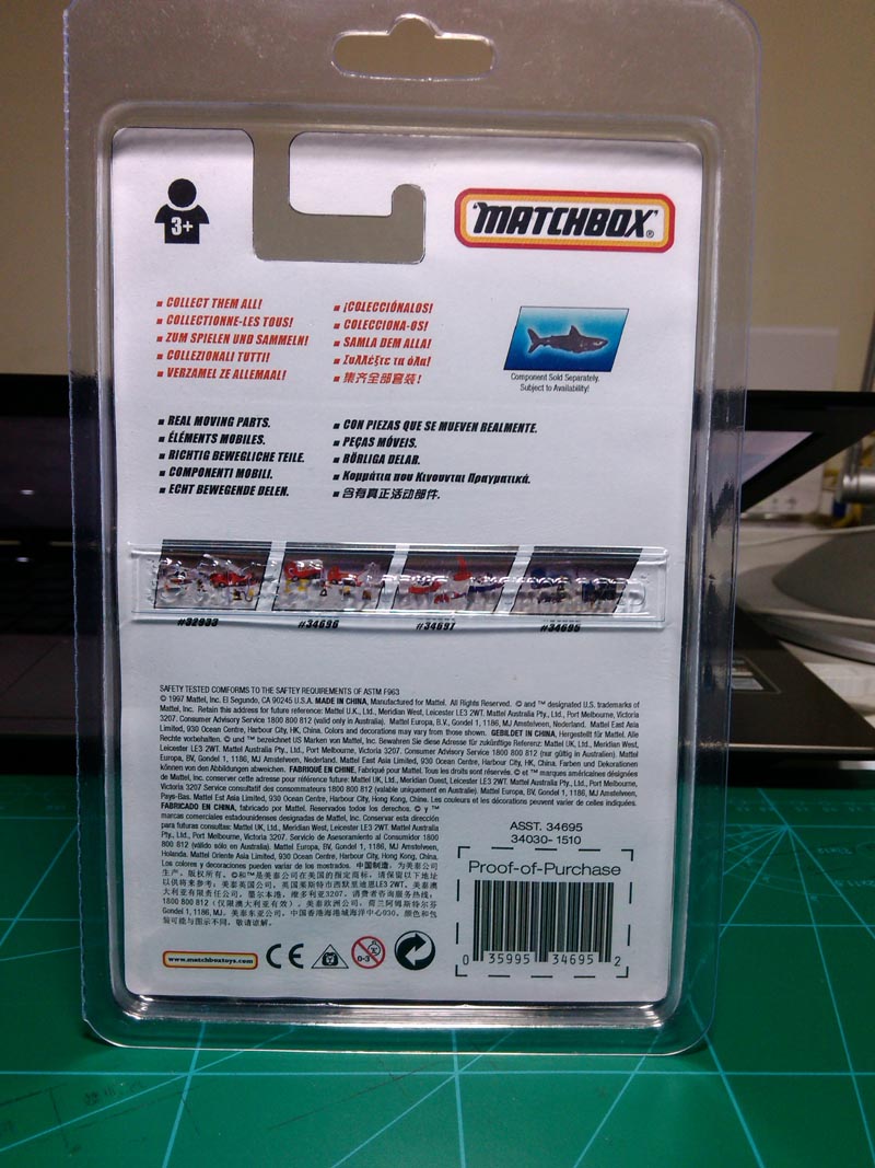 背面重新制作了几个标志,添加欧洲玩具商安全标志——三角框小狮子,以及欧盟安全标志CE、火柴盒网站标志等,这些都是原版套装背面有的内容。