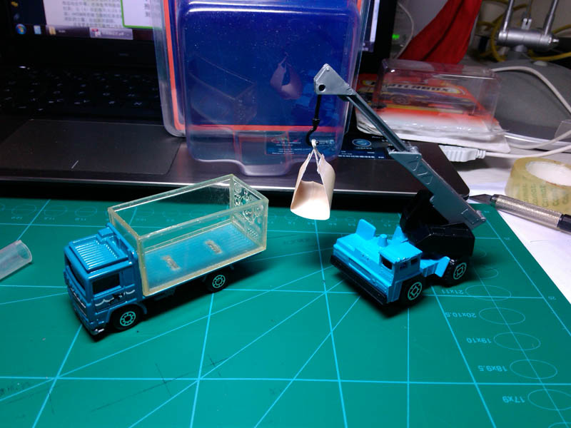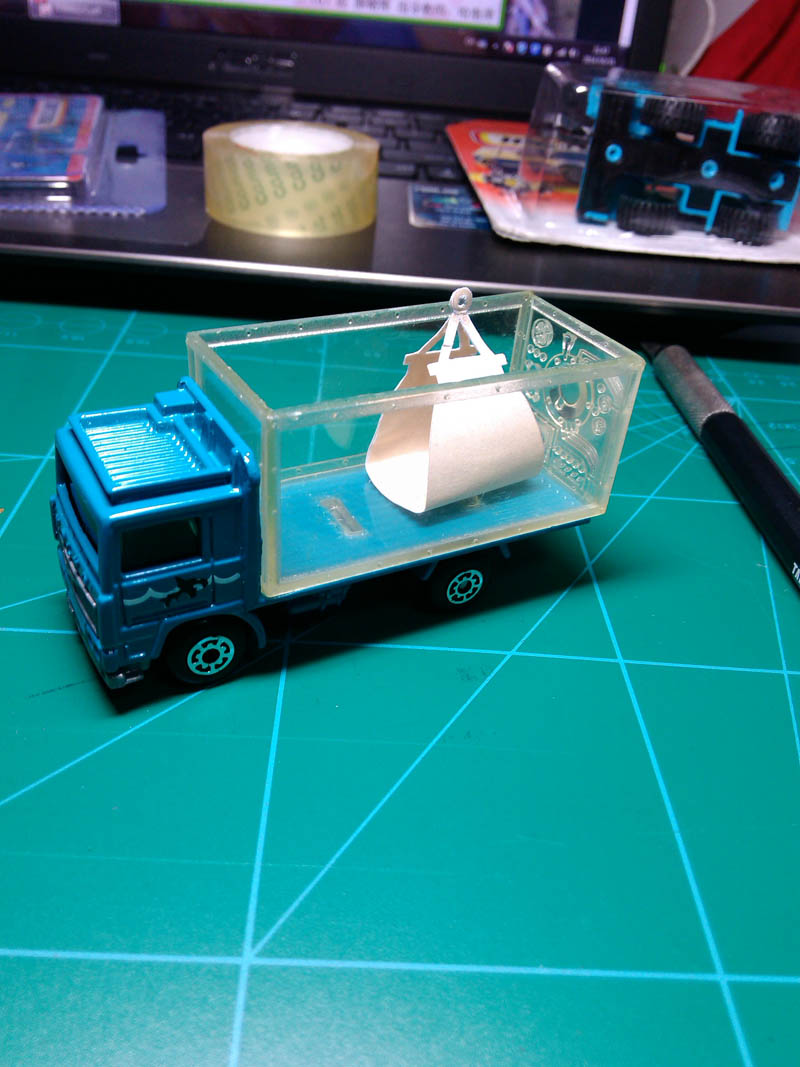 装入包装盒的效果,因为偷懒没有制作纸质衬里,感觉高度不够,但是外包装盒的纵深比较大,车辆会晃动,于是将两个4x4x8的透明盒嵌入,尺寸刚刚好。另外之前做的抓斗可以横卧水族箱内,还不错。