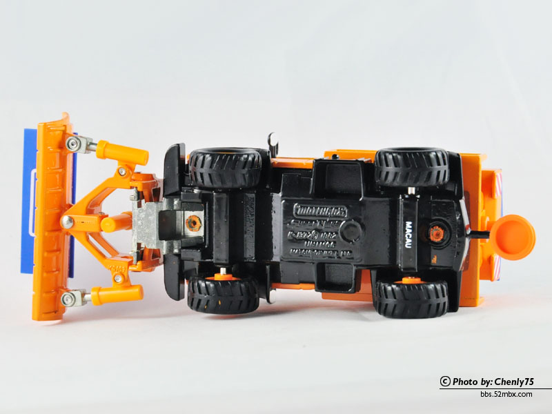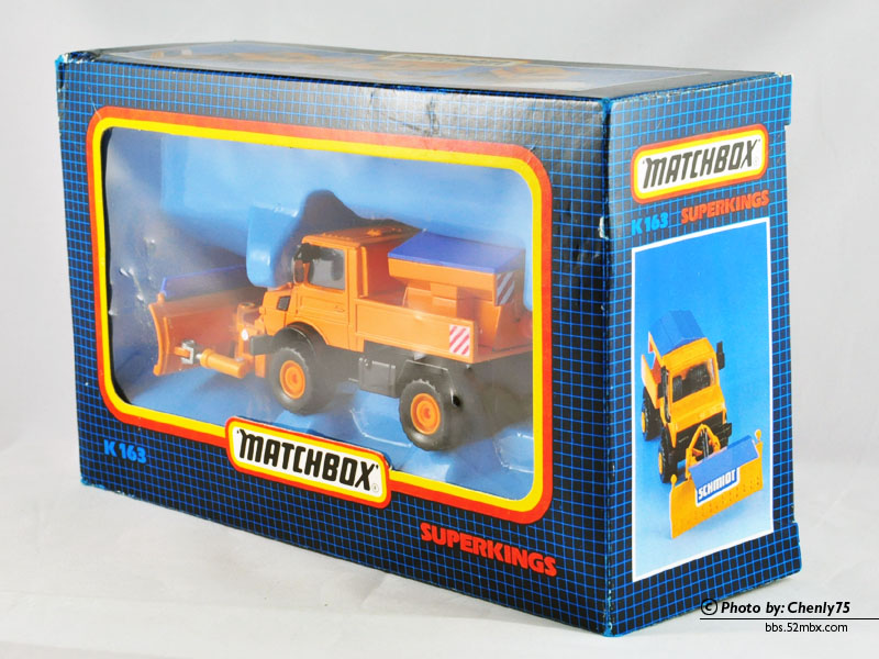 底盘特写:标注的是K137-2,1982年版权,蚀刻环球时代长方形标志、SuperKings标志、厂名Matchbox Int’l Ltd.;产地Macau是印刷在后桥上的。KS163编号则刻在雪铲的金属支架上,顶盖内壁也有刻。