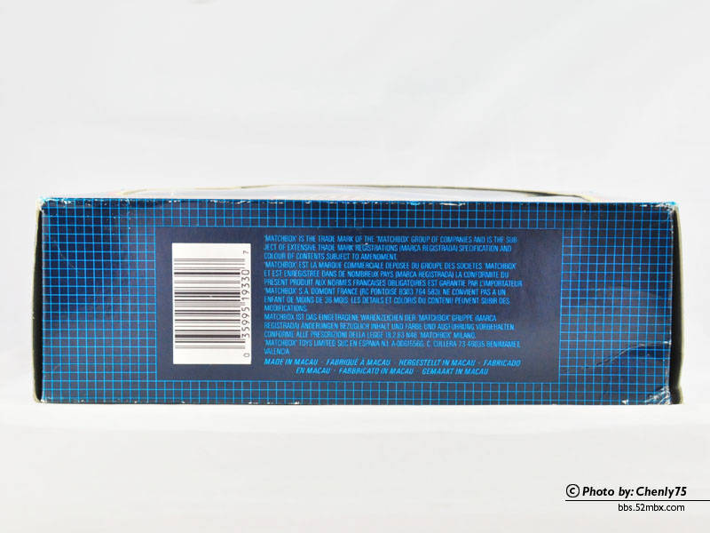 包装是1989年澳门的深蓝盒子,条码编号0-35995-19350-7。其中的35995应该是火柴盒产品的统一销售货号,如今这个编号还在使用,看看美泰出品的常规火柴盒产品的板卡背面是不是还标注了35995-30782的条码?