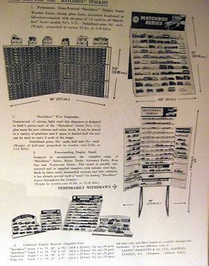 技术进步突飞猛进,我们现在很容易从互联网得到火柴盒的新品信息,而在1950-1960年代,销售商和收藏者们只能依靠印刷品。以下两张图片告诉我们当时的情形。如今我们不得不经常光顾商场,多留意货架,翻翻促销货的垃圾箱,还要自己翻动货架底下的塑料盒子。而50年前的展示是多么一目了然啊?我们很容易就能找到自己想要的模型。