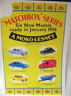 我相信下面的传单是发给销售商告诉他们将会发行什么。我相信那是1957年秋季印刷的,显示出红色的Vauxhall和茶色的Morris Minor都还未计划上市。Jack Odell曾告诉我他从来不收集那些颜色变化,因为那曾经只是一些失误或者没有人会关注这些。他的观点表明模型的涂装可在任何地方进行,但他已记不清火柴盒厂里是何时开始涂装模型的。这些错误时常发生,但这些仅仅是给儿童生产的玩具,被包装和分销出去。他曾说火柴盒主要的油漆供应商Berger paints已制造出新的淡黄色,而且Victor模型用那种淡黄色涂装看起来很漂亮。