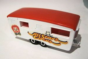 我想知道Dino Adventure套装里的其他模型的样子。下面是两件被否决的涂装配色。在Caravan上,由于钩子的位置过高导致无法被拖行。而蓝色的Volvo的鲨鱼卡车(MB389)原版是透明的。还有哪些模型能联想到呢?
