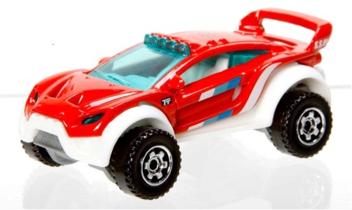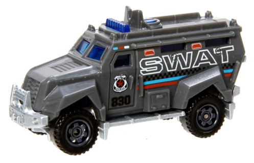 这台Sport SUV (MB568) 涂装粗犷且很有诱惑力。相信是为了蓝色的警灯才把整个车窗染成了蓝色。而这台Road Raider (MB895) 有着红色的车窗和警灯以及越野车轮。SWAT Truck (MB830) 则是该五件套中的第4件,究竟哪一辆车会出现在套装最上面,让我们拭目以待。