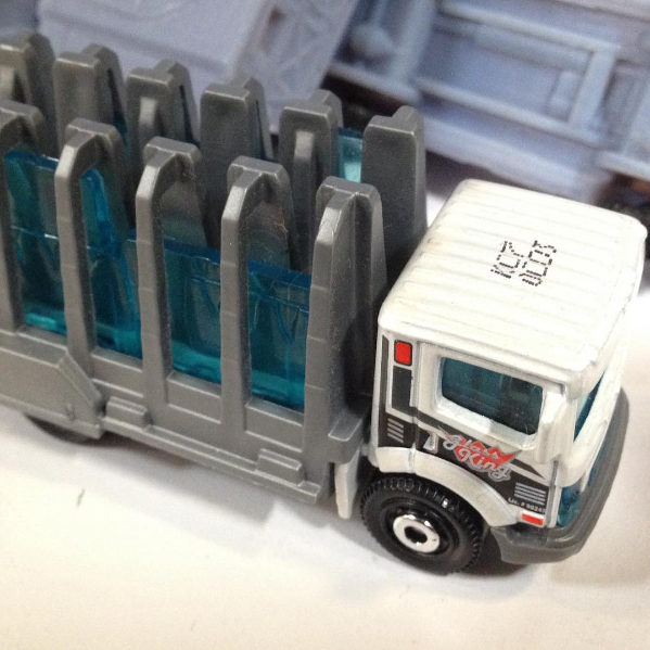 3.1)透明栅栏合金框。当初之所以喜欢这个模型,也许是因为从3D打印版看到了驾驶室背后镂空的防护板栅栏,感觉这个部件如果做得好,一定能彰显火柴盒的开模实力。然而现实却比较残酷,火柴盒的处理方式显得过于讨巧。下图是左后侧放大图,可以看出外框是与车身一体的合金件,而栅栏本身却是与车窗一体的透明件。这很可能与合金模具开发成本有关。如要在一个合金件铸造的时候镂空4×2的小格子,并且要与驾驶室后部相连接,在模具开发上也许比较繁琐。火柴盒采用了不镂空但透明的方式,将纵横格子像浮雕一样刻在车窗背面,产生一种若隐若现的感觉。而正因为这个细节的增加,直接导致前风挡的雨刷细节被省略。现在并不知道成品的货箱地板及驾驶室后围的颜色,但相信一定是内饰的颜色,所以若要使上述栅栏显形,内饰多半会采用深色调,在光线的折射下,感觉一下本应该镂空而现在只能透明的无奈效果吧。