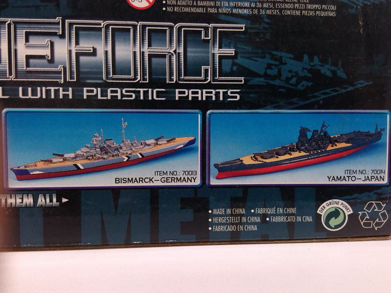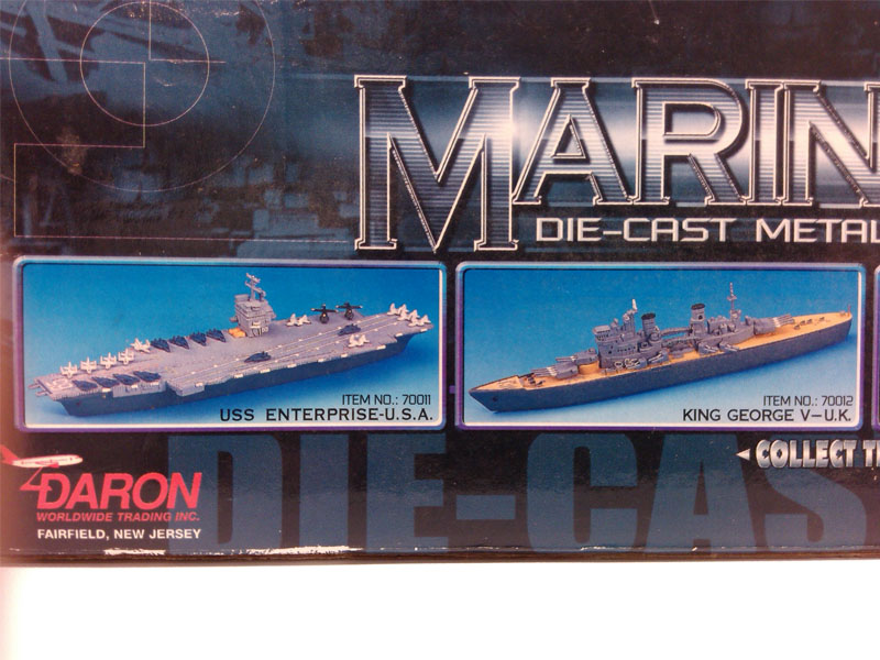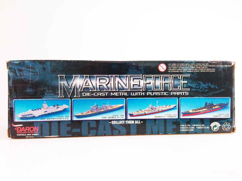 事情的起因很简单。在发掘到Schuco贴牌,由晶鑫工艺品代工的护卫舰模型之后,我又在eBay上找到了一件制作工艺与“乔治国王号”极其相似的另一条水线船——“俾斯曼号”(Bismarck)。记得曾经在某一篇MCCH亲善大使报告中了解到,上海环球SUTC的ZJ系列水线船曾经通过DARON这家贸易公司再包装后在美国销售,而碰巧这个包装上赫然印着DARON的标志,卖家提供的图片非常有限,仅仅包装盒的正面和背面两幅画面,而正是背面的图片引起了我的兴趣。